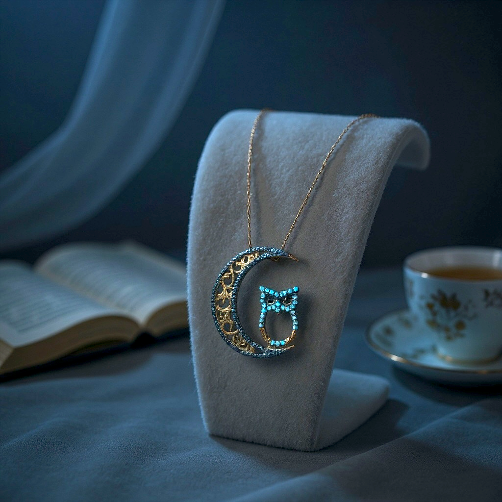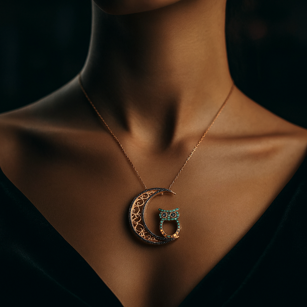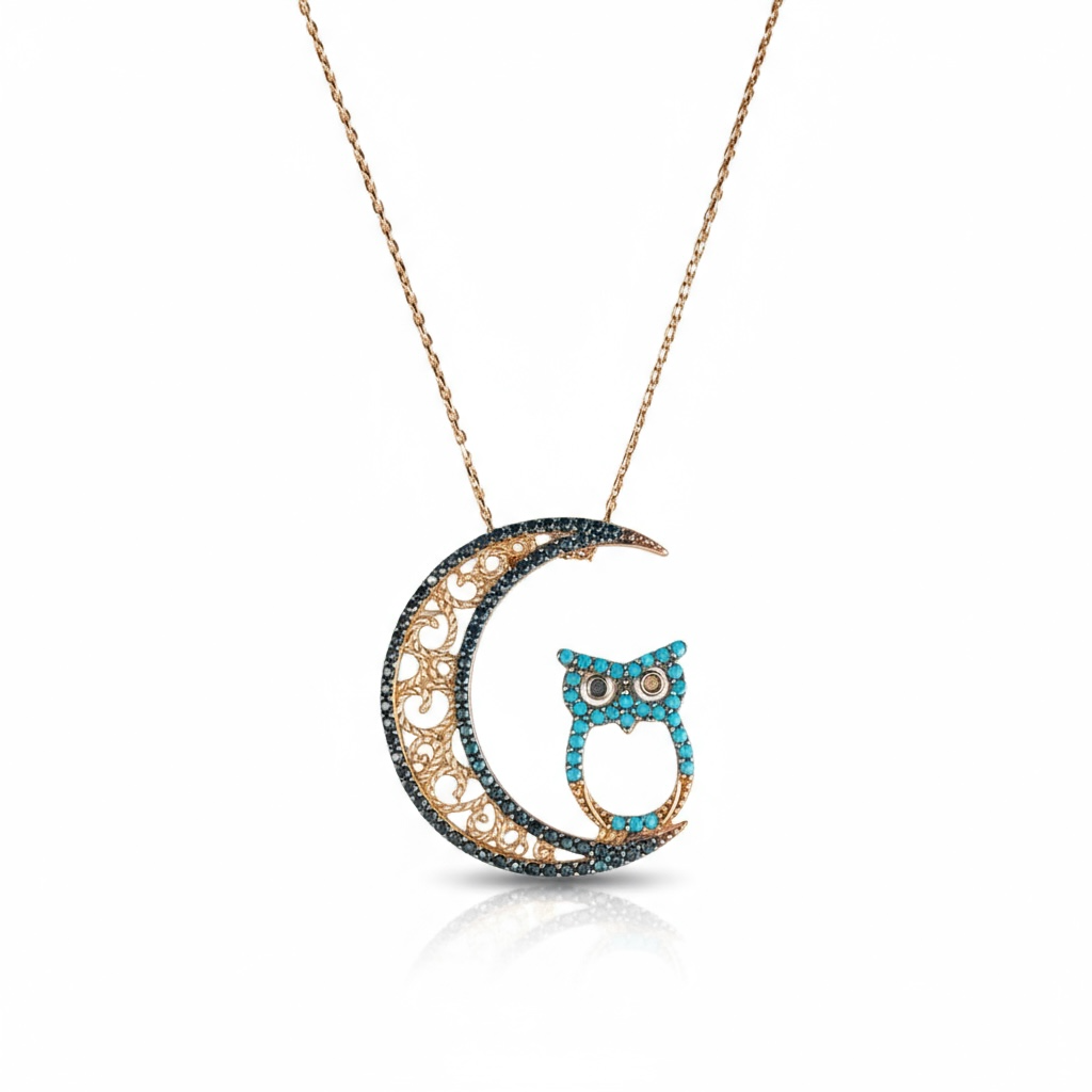 Die Kombination aus schwarzen und türkisfarbenen Zirkoniasteinen sorgt für ein eindrucksvolles Farbspiel und macht die Kette zu einem unverwechselbaren Blickfang. Die Eule – ein Symbol für Weisheit und innere Stärke – wirkt durch die türkisfarbenen Steine lebendig und ausdrucksstark. Der Mond, teilweise mit schwarzem Zirkonia und zarten Goldornamenten besetzt, unterstreicht die geheimnisvolle Ausstrahlung dieses Designs.