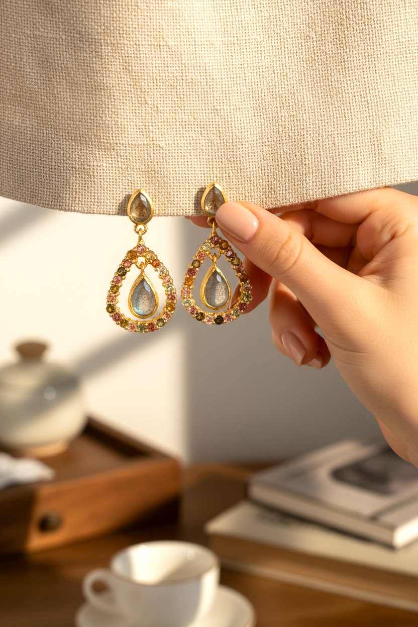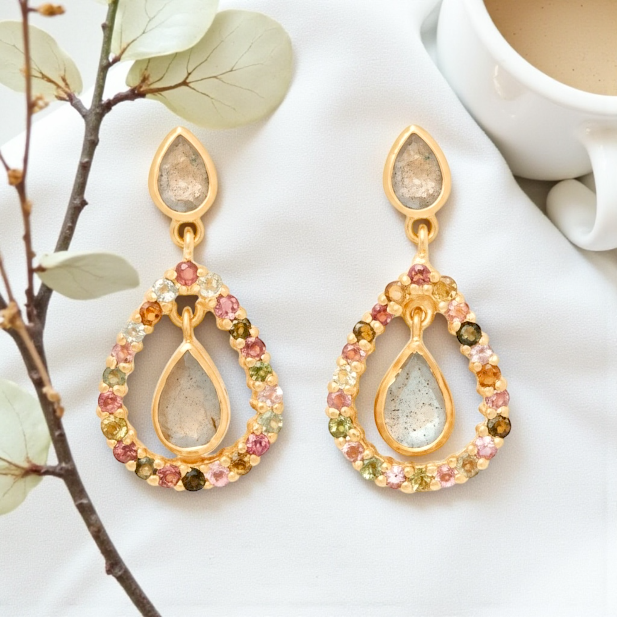 Luxuriöse 18K vergoldete 925 Sterling Silber Ohrringe mit Labradorit & Turmalin – Tropfenform, handgefertigt, 3,5 cm, hypoallergen