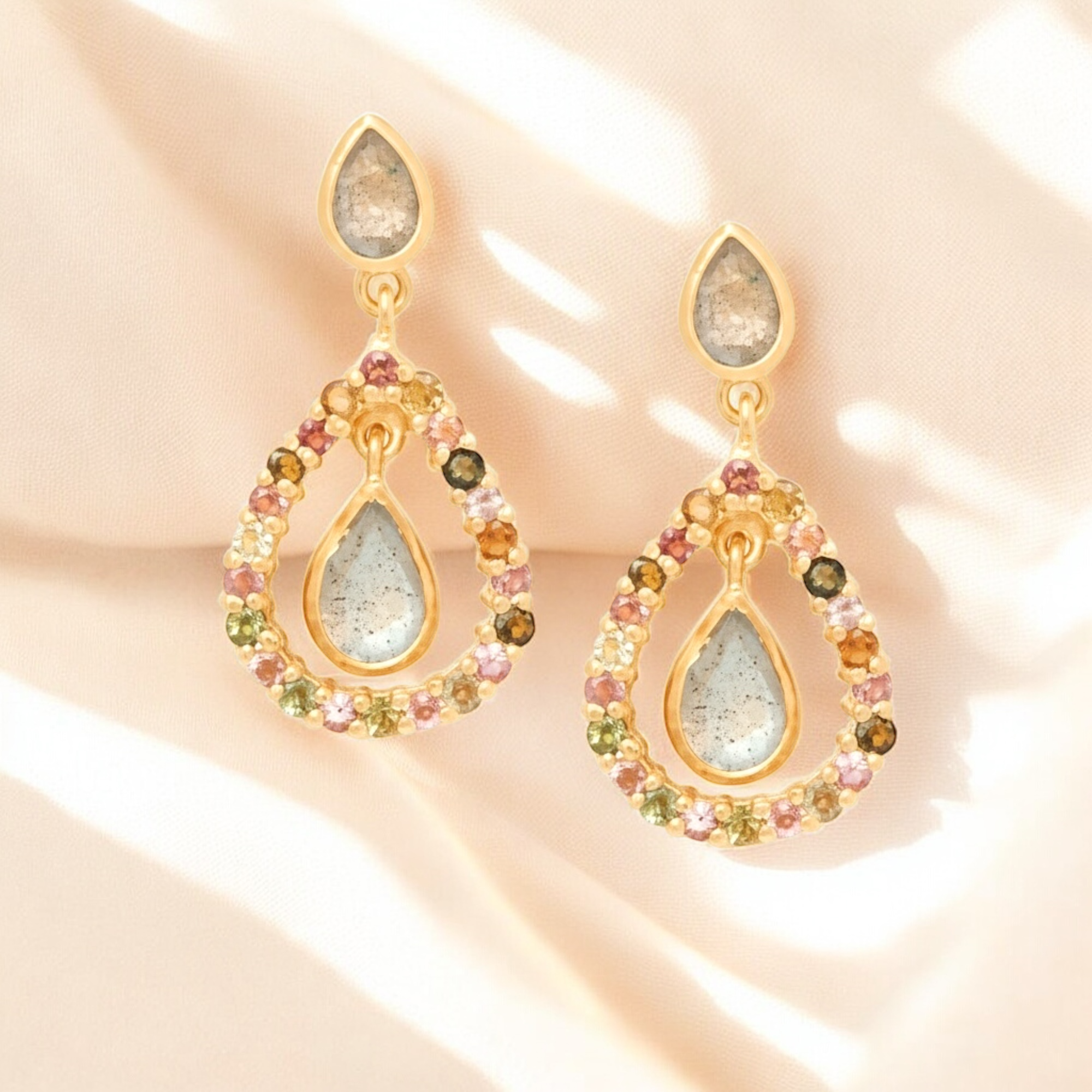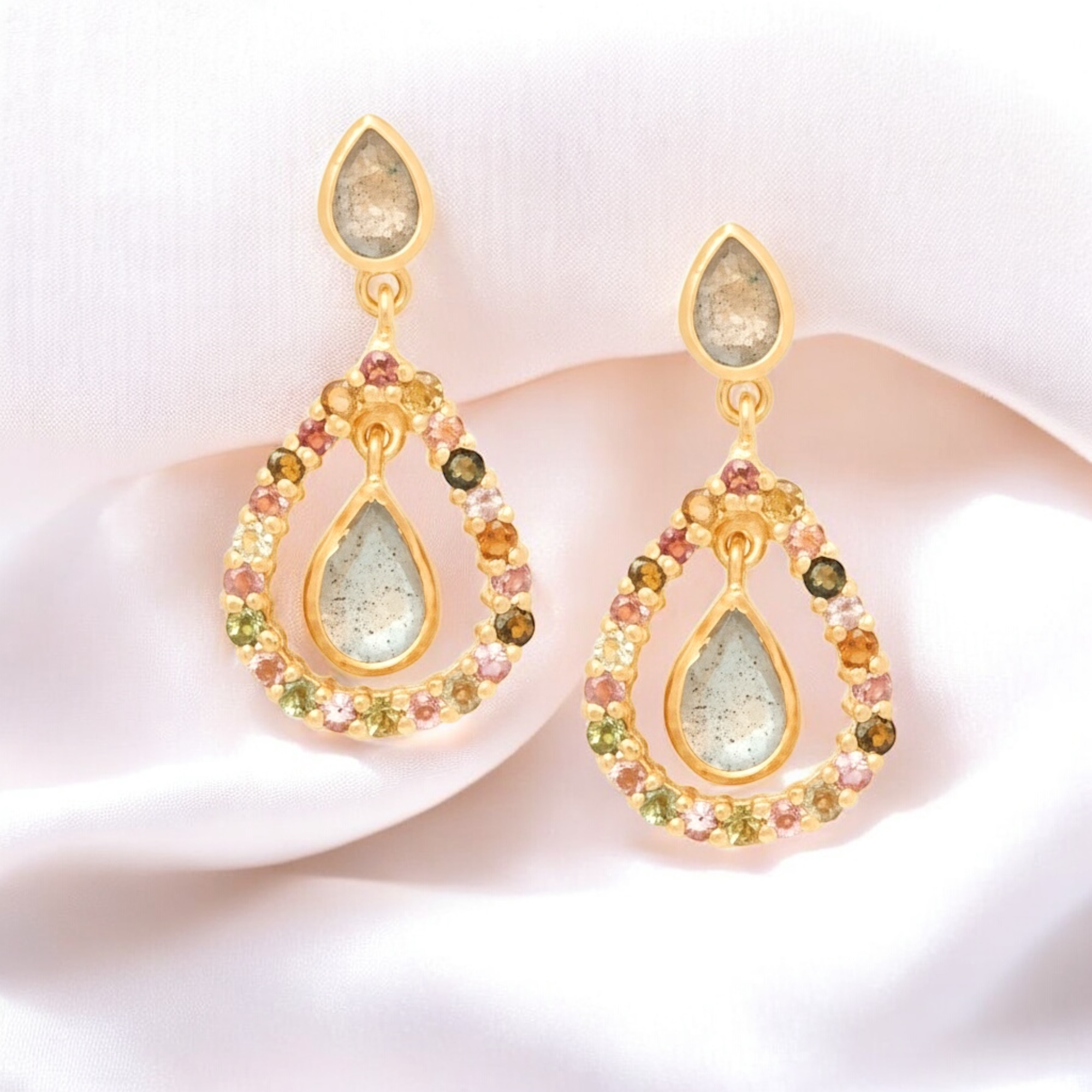 Diese eleganten Ohrringe vereinen natürliche Schönheit und edles Design. Gefertigt aus hochwertigem 925 Sterling Silber und mit 18K Gold vergoldet, präsentieren sie schimmernde Labradorit-Steine in tropfenförmiger Fassung, umrahmt von funkelnden Turmalin-Edelsteinen in sanften Regenbogenfarben. Jeder Stein ist einzigartig und sorgt für ein luxuriöses Farbspiel bei jeder Bewegung.