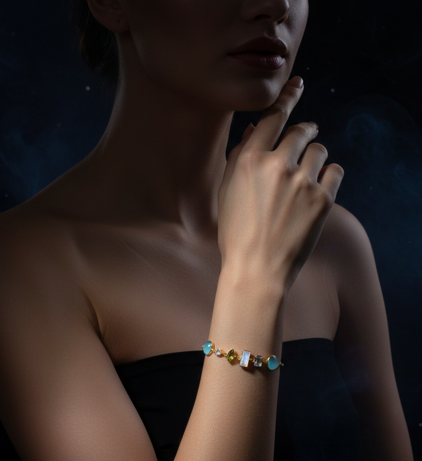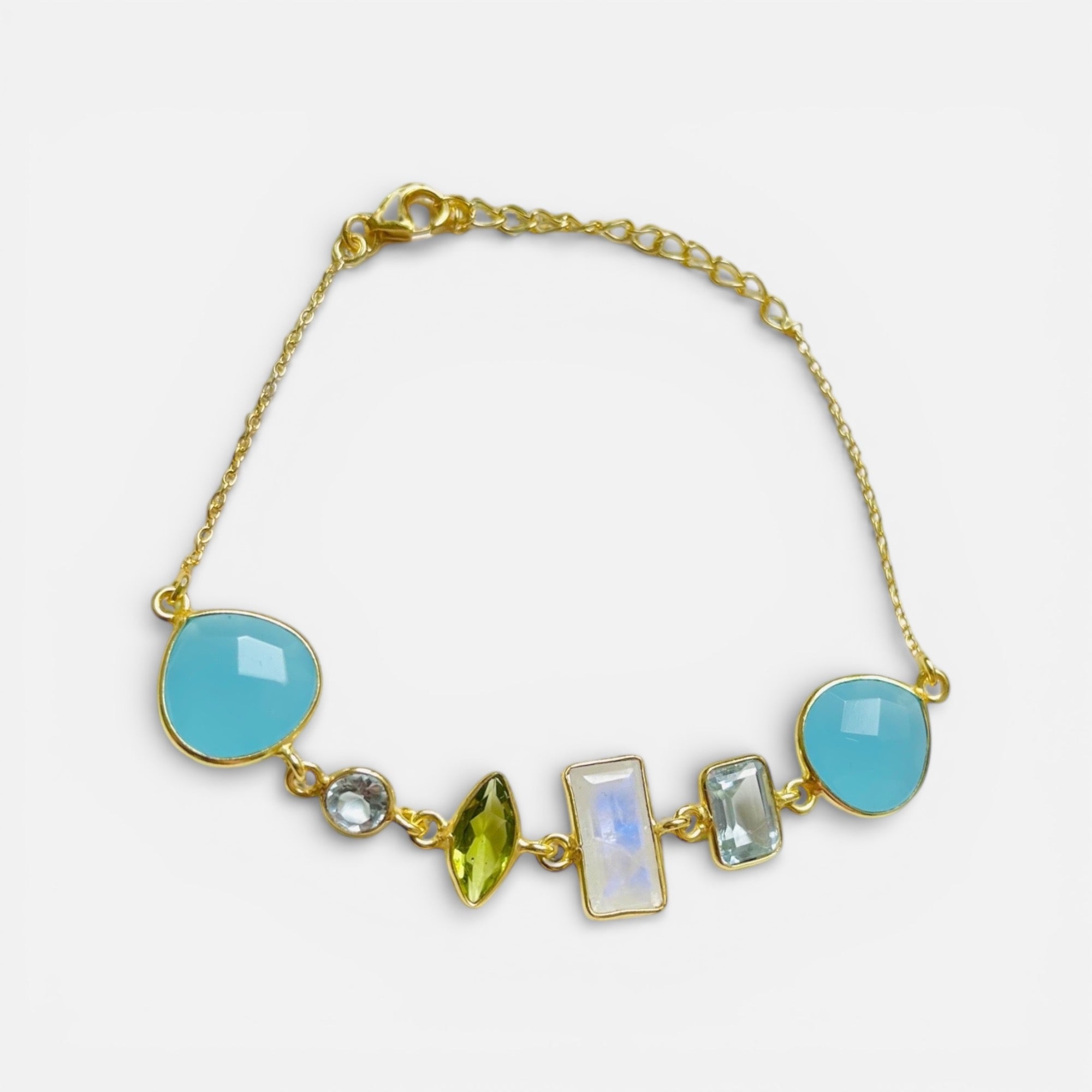 Das Highlight dieses Armbands sind jedoch die atemberaubenden Edelsteine, die kunstvoll in das Design eingearbeitet wurden. Der Chalcedon, Aquamarin, Mondstein und Peridot wurden sorgfältig ausgewählt, um eine harmonische Mischung aus Farben und Texturen zu schaffen.