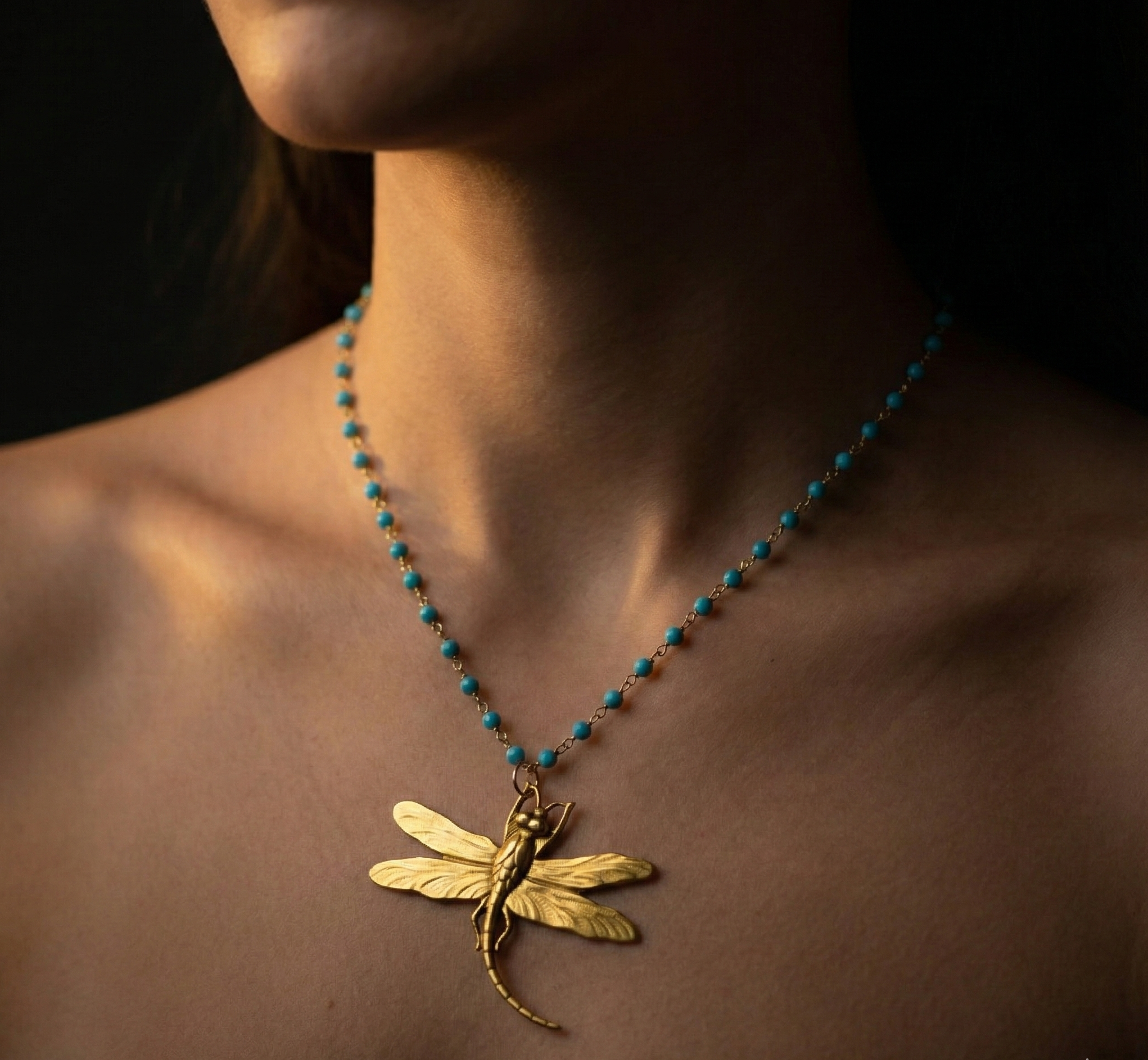 Diese Kette passt gut zu schlichten Outfits, gibt aber auch festlichen Looks eine warme Note. Viele Kundinnen wählen sie als Geschenk, weil Türkis ein vielseitiger Edelstein ist und die Libelle eine positive Wirkung hat.