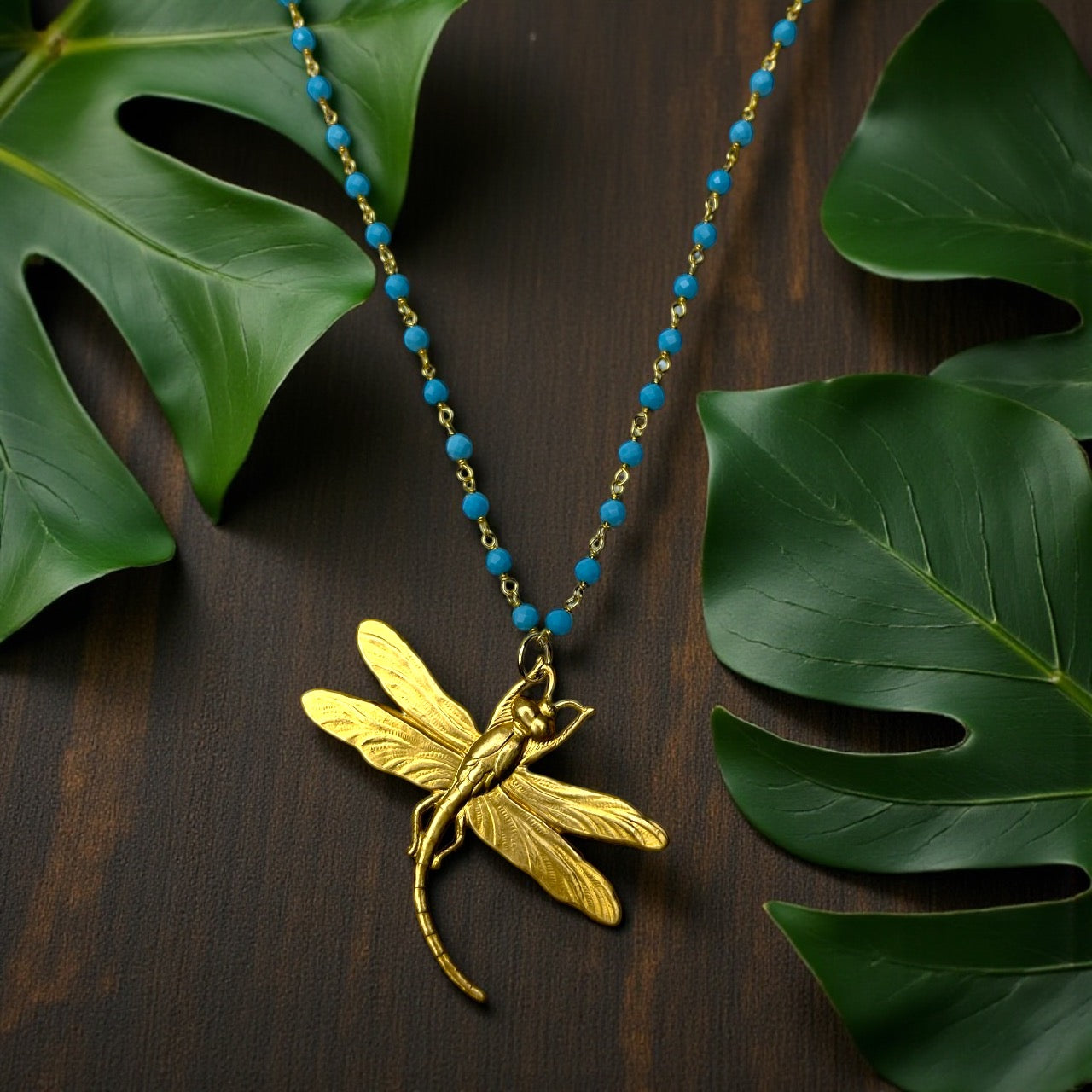 Türkis Edelsteinkette mit vergoldeter Libelle, 60 cm, hypoallergen, nickelfrei, eleganter Anhänger