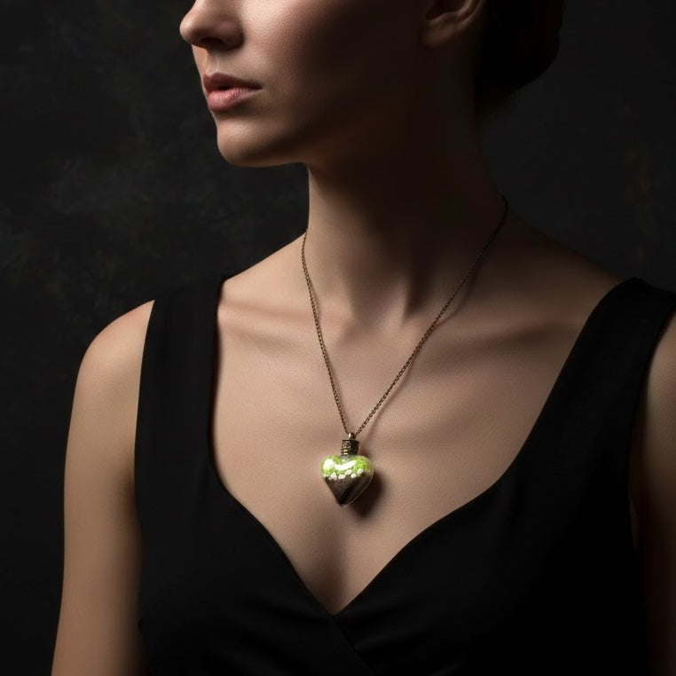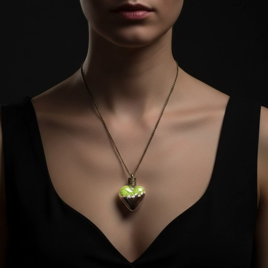 Dieser wunderschöne Terarrium-Anhänger in Herzform mit einer 70cm langen Bronze-Kette ist das perfekte Accessoire für alle Naturliebhaber. Der Anhänger ist mit Moos, Kieselsteinen und Erde gefüllt und bietet somit ein Stück Natur zum Mitnehmen.